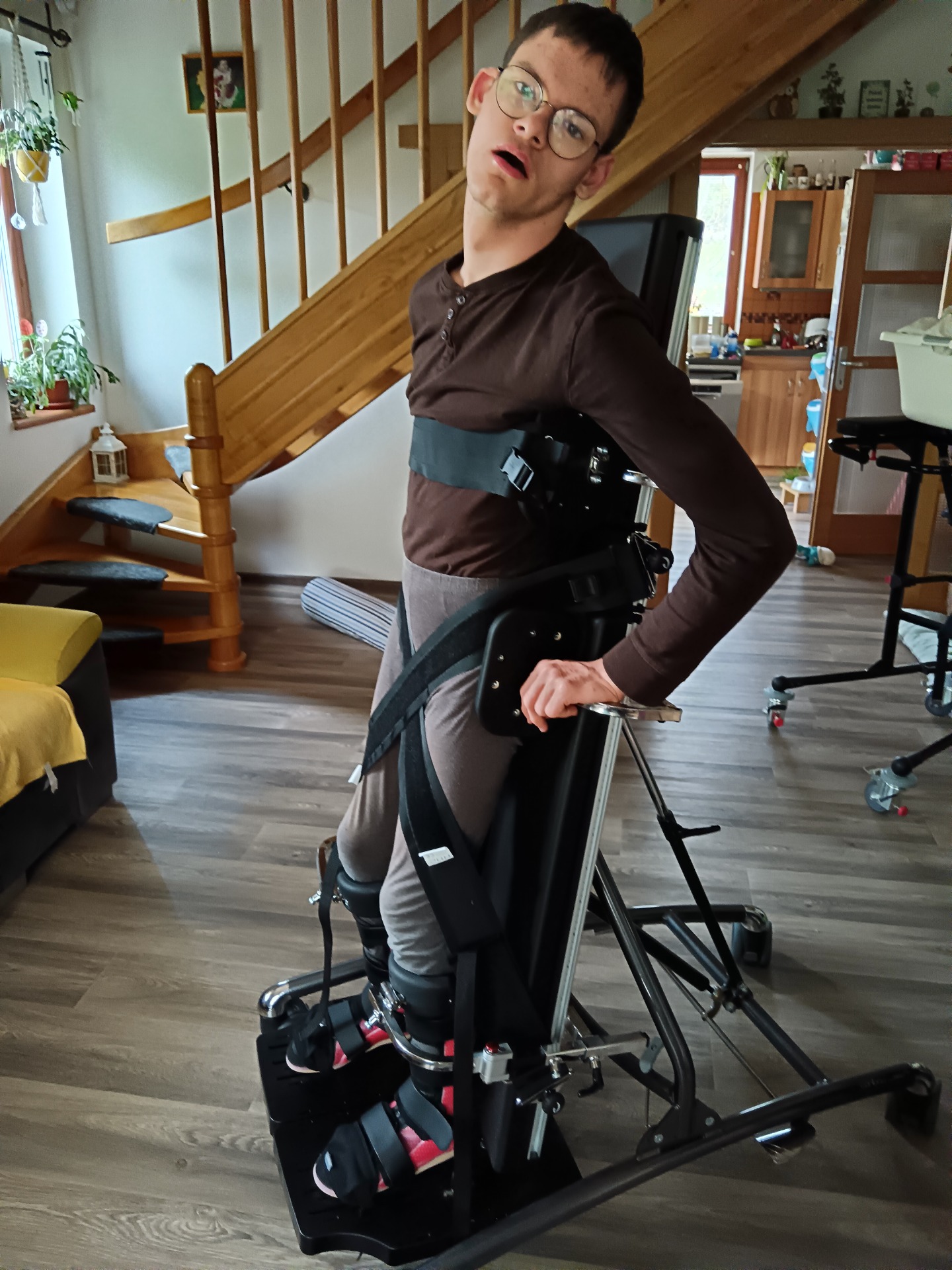 Mezitím probíhal covid. Kluci moc špatně snášeli distanční výuku. I když mají oba skvělé paní učitelky, které s nimi i na dálku krásně pracovaly, natáčely videa, volali si a dělaly výuku online, zejména Fanda to nesl blbě. Přestal se smát, nemohl jíst a spát, vrzal zubama a podle rehabilitační terapeutky přestal používat celou pravou polovinu těla, včetně oka. Dlouho se z toho dostával. Ale všem paním učitelkám jsme neskutečně vděční, jak se klukům věnovaly a věnují doteď. V té době jsme pořád dojížděli na týdenní pobyty do Českých Budějovic za terapeutkou synergické reflexní terapie Renatou Vodičkovou, která je machr ve svém oboru. Také jsme jezdili za Ivetou Varmusovou do Třince, která je Feldenkreis terapeut. V letech 2021-2024 absolvovali oba kluci několik ošetření zubů pod narkozou. Normálně jsou neošetřitelní. Všechny ty zákroky jsme kromě jednoho museli zaplatit, za každého syna to bylo vždy kolem 20 až 25 tisic korun. V roce 2022 v červnu se nám podařilo Vítkovi splnit přání a v průběhu pár týdnů jsme se rozhodli, zařídili a odjeli autem k moři. Bylo to na to nejbližší místo v Chorvatsku s přespáním v Grazu. Na jeden zátah bychom to nezvládli. Ale kluci byli úžasní a tak jak normálně pořád mluví a ptají se na stejné věci dokola a vymýšlí, tak na téhle cestě byli milionový. Asi jak se těšili. Bydleli jsme v bungalovu v jednom resortu. Měli jsme štěstí na krásně teplé moře a na pláže, kde byli vstupy do moře se zábradlím a vysypané oblázky. Takže ideální podmínky pro nás. Domu jsme my rodiče přijeli zničení, utahaní ale šťastní že jsme to zvládli. A kluci byli nadšení. Moc nás mrzí, že naše dcera Terezka se akcí, kde jedeme s klukama nechce účastnit, aby s námi nebyla vidět. Takže ani u moře s námi nebyla. Ale netlačíme jí do toho, protože potom je to kontraproduktivní a jen se hádáme. Na jaře 2023 jsme začali kromě Budějovic a Třince jezdit ještě na rehabilitační pobyt do centra Kruh Znojmo, kde měli kluci spoustu terapii, bylo to tam super. Ale po příchodu nového vedení se podmínky dost změnili, terapií ubylo,a tak jsme se rozhodli už tam nejezdit. Vedlo nás k tomu hlavně také to, že kluci mají čím dál větší problém spát v prostředí mimo domov, zejména Fanda. Byl schopný několik nocí prosedět na posteli, křečovitě se držet matrace a propocený nažmach. Byli jsme z toho zničení všichni. U Fandy se s nástupem puberty začaly objevovat autistické rysy a návaly agrese. Je s ním někdy hodně těžké pořízení. Každé vyhýleni ze známeho a zajetého ho rozhodí. Z těchto všech důvodů jsme se rozhodli eliminovat pobytové rehabilitace a dojíždíme a docházíme na terapie v okolí domova a školy a nebo za nám chodí terapeuté domů. Kluci v současné době mají fyzioterapii v centra Apolena v Jihlavě, Feldenkreis terapie v Jihlavě, jezdíme na vodní Watsu terapii v bazénu, doma je masíruje pan masér, dostávají kraniosakrální ošetření a polaritní terapii. Doma máme ještě perličkovou koupel, masážní lehátko a infračervené světlo. Letos na jaře jim vyrobili na protetice speciální ortézy na stání ve stojanu a na částečnou úhradu společně s pojištovnou jsme jim objednali vertikalizační stojan. S doplatkem nám pomohla charita Pelhřimov. Co se týká terapií, tak jediný pobyt, který jsme si nechali,je srpnový terapeutický týden. Dřív býval v Beskydech a poslední dva roky jsme byli ve Frenštátu pod Radhoštěm. Jezdíme tam už asi 8 let pořád se stejnými rodinami. Všichni máme hendikepované děti a už to bereme tak, jako kdybychom jeli za rodinou. Všechny děti tam mají každý den kraniosakrálku a feldenkreise. Někdy zbyde prostor i na ošetření pro rodiče. Taky tu péči moc potřebujeme.A halvně je to teraputické pro nás rodiče v tom, že vždycky probereme stejné nebo podobné věci, které v životě řešíme. To se s lidmi, kteří takový život neznají, těžko řeší. Proto se nám děje i to, že nemáme moc přátel a kamarádů. Jsme už tak ,,deformovaní,, tímhle životem, že je pro nás těžké se zapojovat do debat co vedou ostatní lidi.Jsme pro ně tak trochu mimoňové.