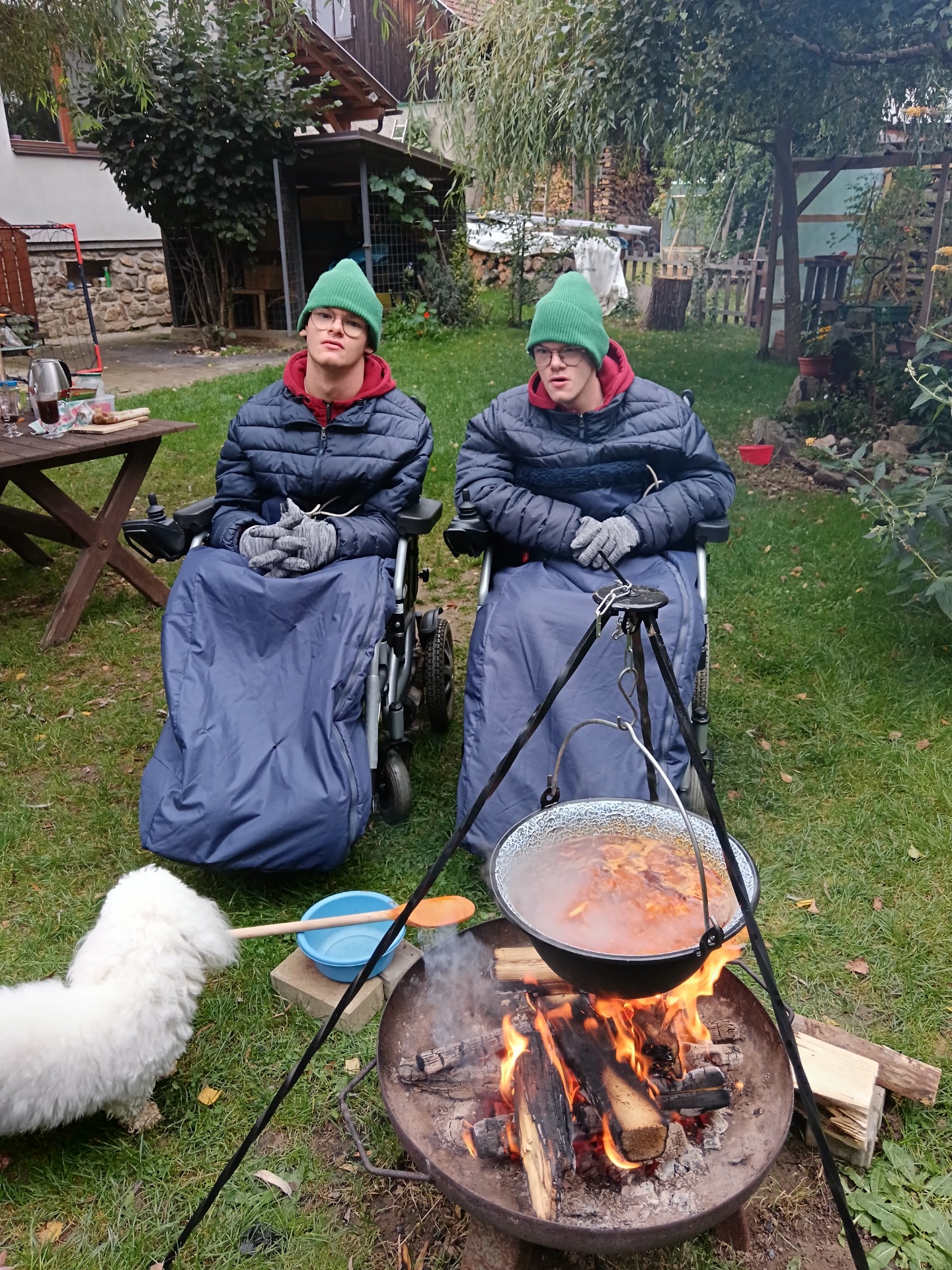 Všechny terapie, o kterých píšu, kromě části fyzioterapie musíme hradit sami. Klukům toneskutečně pomáhá a tak jsme nuceni pořád někde shánět peníze, u nadacích a hodných lidí. Je to ale čím dál těžší, sbirek je čím dál víc, lidé mají málo peněz a nadace raději dají malinkým dětem, než velkým klukům. Hradíme i asistenci ve škole, protože kluci se bez celodenní pomoci neobejdou,potřebují pomoc úplně ve všem. Nově začali navštěvovat centrum denních služeb Medou v Humpolci, kde se jim moc líbí, ale také to vyjde na dost peněz. Předloni jsme,po odchodu našeho pejska Ostina, který s nami byl 10 let, pořidili nového psího kamaráda Michala. kluci ho milují a on je pro ně také velký terapeut. Kluci mají rádi všechny zvířata. Dříve jsme hodně jezdili i na hipoterapii, která jim dělala moc dobře, ale jak už jsou velký, tak je nikdo vozit nechce. Stejně tak mají rádi hudbu, ať už jí poslouchají, nebo si zpívají. Už dva roky jezdíme na koncerty Libkovanky, což si velmi užívají. Vezmou si košile a sváteční kalhoty a jede se. Tam si zazpivaji,znají spoustu dechovkových písniček. A když je podržíme v podpaží ve stoji, tak si i ,,jakoby,, zatančí (jako ostaní lidi), jak říká Fanda. Dají si nealko pivo a jedem zase domu. V roce 2026 v lednu jim už bude 17. Za rok budou končit ve škole, protože pro ně na praktické škole nebude místo, budeme muset hledat, kam by mohli potom docházet. Kdyby zůstali doma tak by to bylo zničující, hlavně psychicky, pro všechny. Máme na sebe už děsnou ponorku. Snažili jsme se jim najít kamarády i jen na povídání nebo telefonování, ale nikdo se nenašel. Byli bychom vděční i za někoho, kdo by nám byl ochotný a schopný pomoci s péčí, abychom si mohli odpočinout, ale nikdo takový se taky nedaří najít. Moc doufáme a přejeme si, abychom se o syny mohli starat co nejdéle a moc děkujeme že nám v tom pomáháte nezanedbatelnou finanční pomocí.